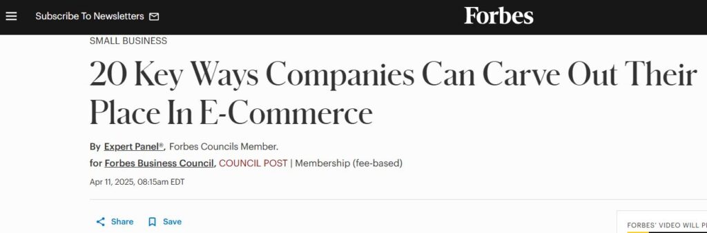 Recognized as a featured expert across Forbes panels on digital leadership, e-commerce strategy, AI adoption, and sustainable business practices.